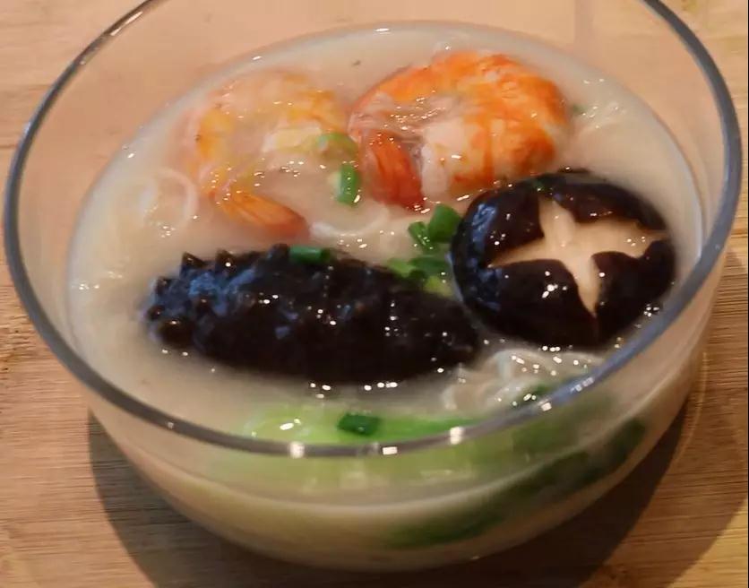 原料:海晏堂即食海參、雞湯、草蝦、鮮香菇、貢面、香蔥、鹽