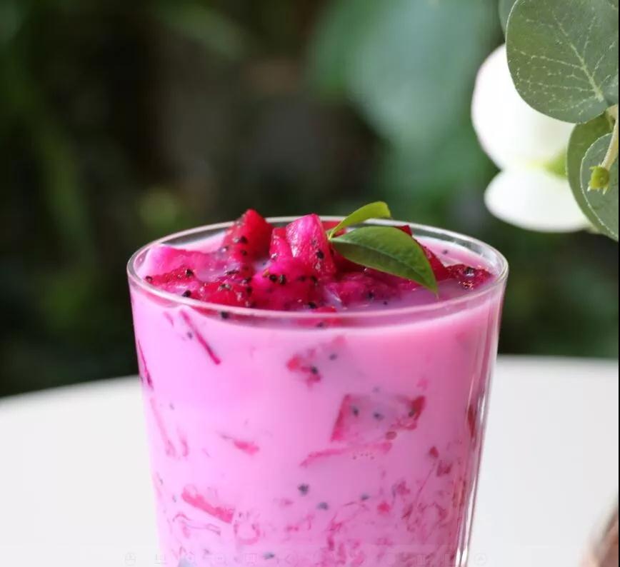 6、接著放進(jìn)火龍果,最后在慢慢倒進(jìn)牛奶。