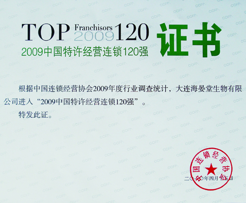 海晏堂榮膺“2009中國特許經(jīng)營連鎖百強(qiáng)”稱號。
