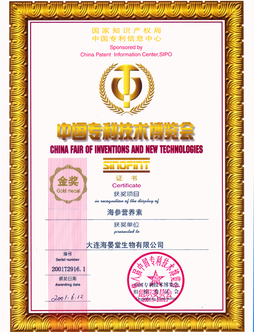 海晏堂海參營養(yǎng)素獲中國專利技術(shù)博覽會金獎。