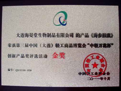 大連海晏堂生物有限公司的產(chǎn)品“海參膠囊”榮獲第三屆中國(大連)輕工商品博覽會“中輕萬花杯”創(chuàng)新產(chǎn)品獎評選活動金獎。
