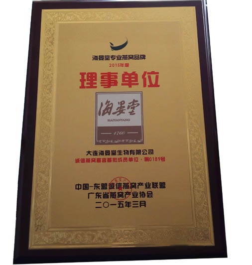 大連海晏堂生物有限公司獲得“中國-東盟誠信燕窩產(chǎn)業(yè)聯(lián)盟及廣東省燕窩產(chǎn)業(yè)協(xié)會的聯(lián)名理事單位”稱號。