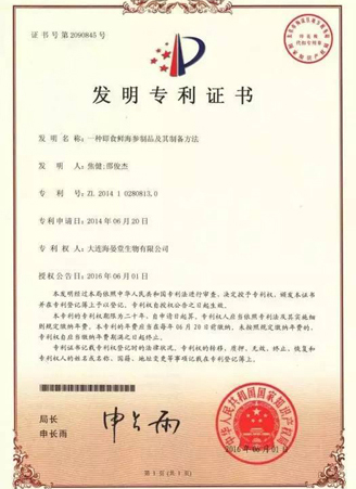 一種即食鮮海參制品及其制備方法獲得發(fā)明專利,被國家知識產(chǎn)權(quán)局授予發(fā)明專利證書。