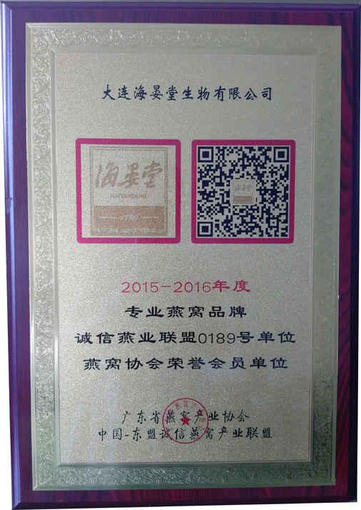 大連海晏堂生物有限公司被廣東省燕窩產(chǎn)業(yè)協(xié)會、中國-東盟誠信燕窩產(chǎn)業(yè)聯(lián)盟認(rèn)定為2015-2016年度專業(yè)燕窩品牌、誠信燕業(yè)聯(lián)盟單位、燕窩協(xié)會榮譽會員單位。