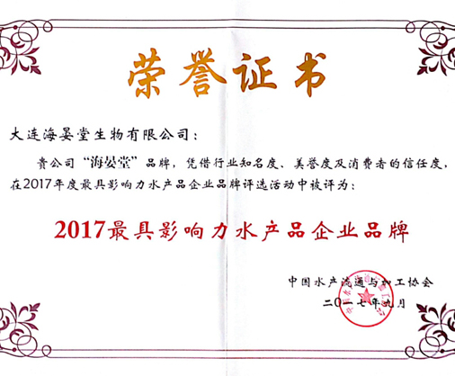 海晏堂憑借行業(yè)知名度、美譽度及消費者的信任度,被評為2017最具影響力水產(chǎn)品企業(yè)品牌。