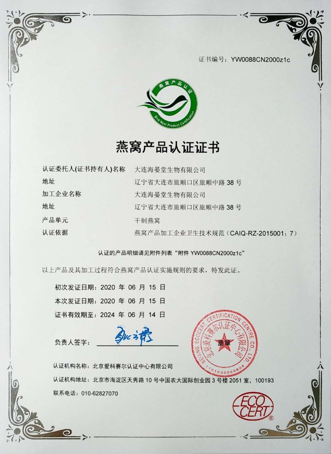 2020年6月,獲得“燕窩產(chǎn)品認(rèn)證證書”