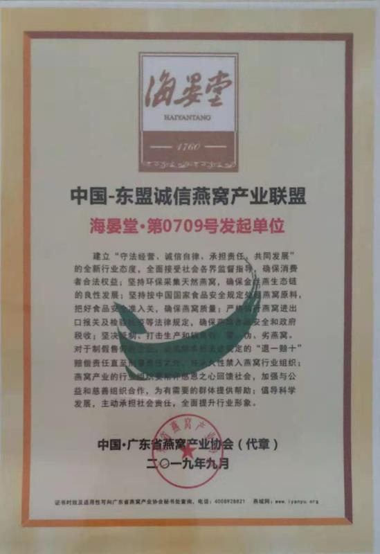 2019年9月,成為中國——東盟誠信燕窩產(chǎn)業(yè)聯(lián)盟海晏堂·第0709號發(fā)起單位