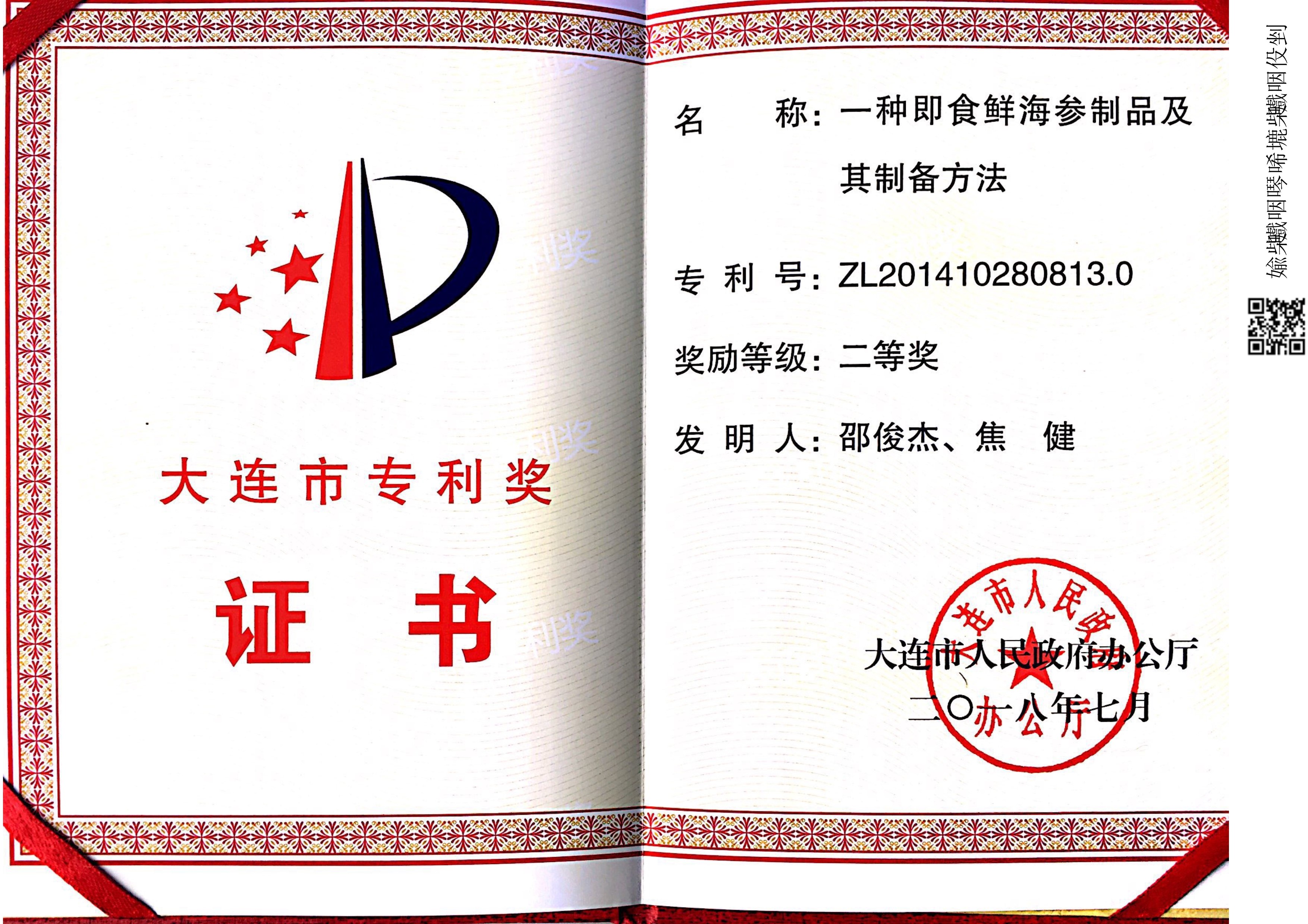 2018年7月,一種即食鮮海參制品及其制備方法獲得大連市專利二等獎。